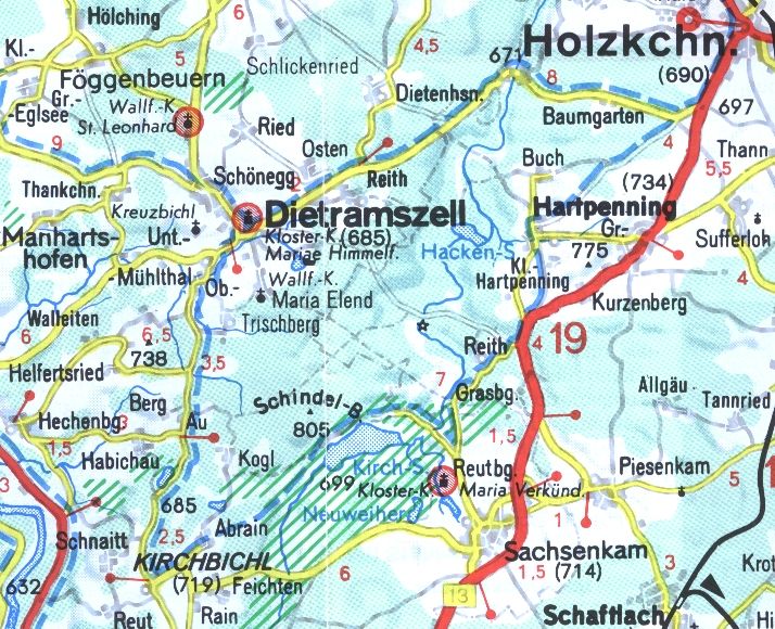 Kloster Reutberg (ca. 10 km), dort kehren wir zum Mittagessen ein. Anschließend lädt der Kirchsee oder der Abrainer Weiher zum Baden ein. Wir sollten uns aber nicht zu lang aufhalten, da die längste Strecke noch vor uns liegt. Vom Badesee aus geht es dann über Kirchbichl und Au nach Dietramszell (ca. 10 km), wo der dortige Klostergarten nochmal Abkühlung und Erfrischung verspricht, bevor wir das letzte Stück zurück nach Holzkirchen in Angriff nehmen (ebenfalls nochmal 10 km). Im Großen und Ganzen sind auf der Strecke keine schwierigen Steigungen zu erklimmen und deshalb ist sie auch für jedermann geeignet. siehe Landkarte blaugestrichelte Linie. |